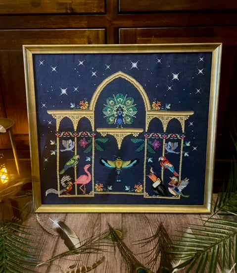 The birds have gathered for a grand meeting on a starry night, hosted by the Peacock and featuring a variety of exotic birds which are individually listed in the chart.