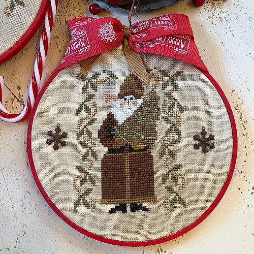 One of the Elves Collection, featuring a Santa in green holding a Christmas tree.