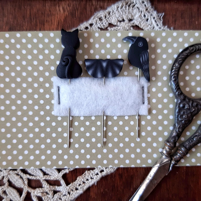 Three beautiful handmade pins featuring a trio of spooky animals; black cat, bat, and crow.