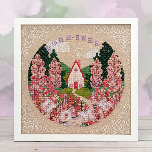It’s a classic for a reason — there’s no place like home! This modern cross stitch design features a cozy little cottage nestled in a valley of wildflowers, with trees flanking its sides and mountains with fluffy clouds in the background. A winding rock path leads up to the door, and the words “Home Sweet Home” circle the scene. Blackwork reminiscent of lace frames the composition in the corners.