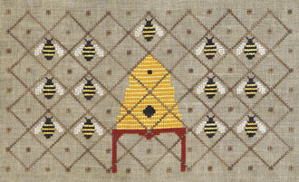 Sitting in reverie and listening to the gentle hum of honey bees creating sweetness! Enjoy cross-stitching these spirited bees adorning a majestic Table-Top Bee Skep.
