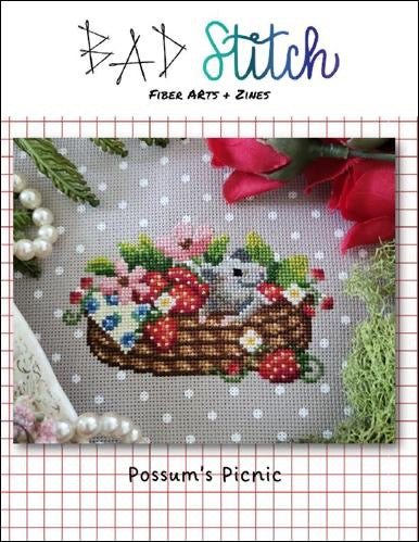 A cute possum resting in a woven basket filled with fresh strawberries and pink cornflowers.