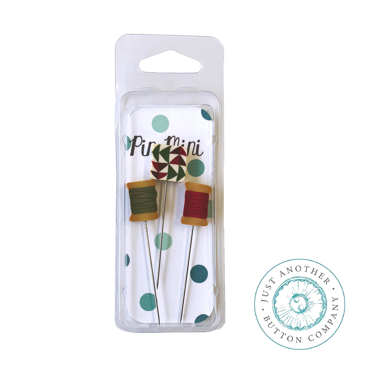 Handmade JABC button slices mounted on a stainless steel sewing pin.