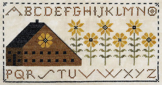 In the cool crisp air on a lovely Autumn day, a quaint New England Saltbox graces a splendid field of Sunflowers that are ripe for harvesting. Rich shades of Fall colours and an uppercase alphabet complete this simple sampler!