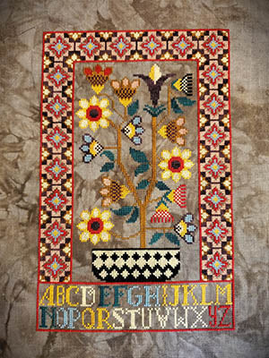 Lovely cross stitch pattern designed by Gigi Reavis, aka The Artsy Housewife, featuring a beautiful, bold, border surrounding a quirky pot full of flowers.
