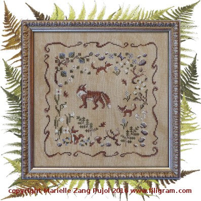 Designed by Marielle Zang Pujol. Lovely pattern featuring, a family of foxes amidst flowers, rocks, and butterflies. Full DMC conversion provided.